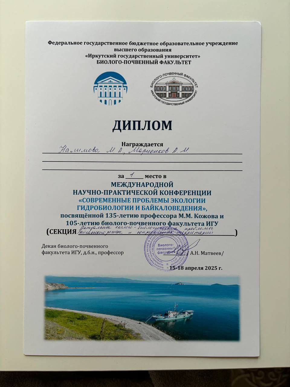 On April 15-18, the International Scientific-Practical Conference “Current Problems of Ecology, Hydrobiology and Baikal Science" was held at Faculty of Biology and Soil Science of ISU dedicated to the 135th anniversary of the birth of Professor M.M. Kozhov and the 105th anniversary of the Faculty of Biology and Soil Science of ISU, in which Maria Nalimova, a young employee of our Institute, took part.