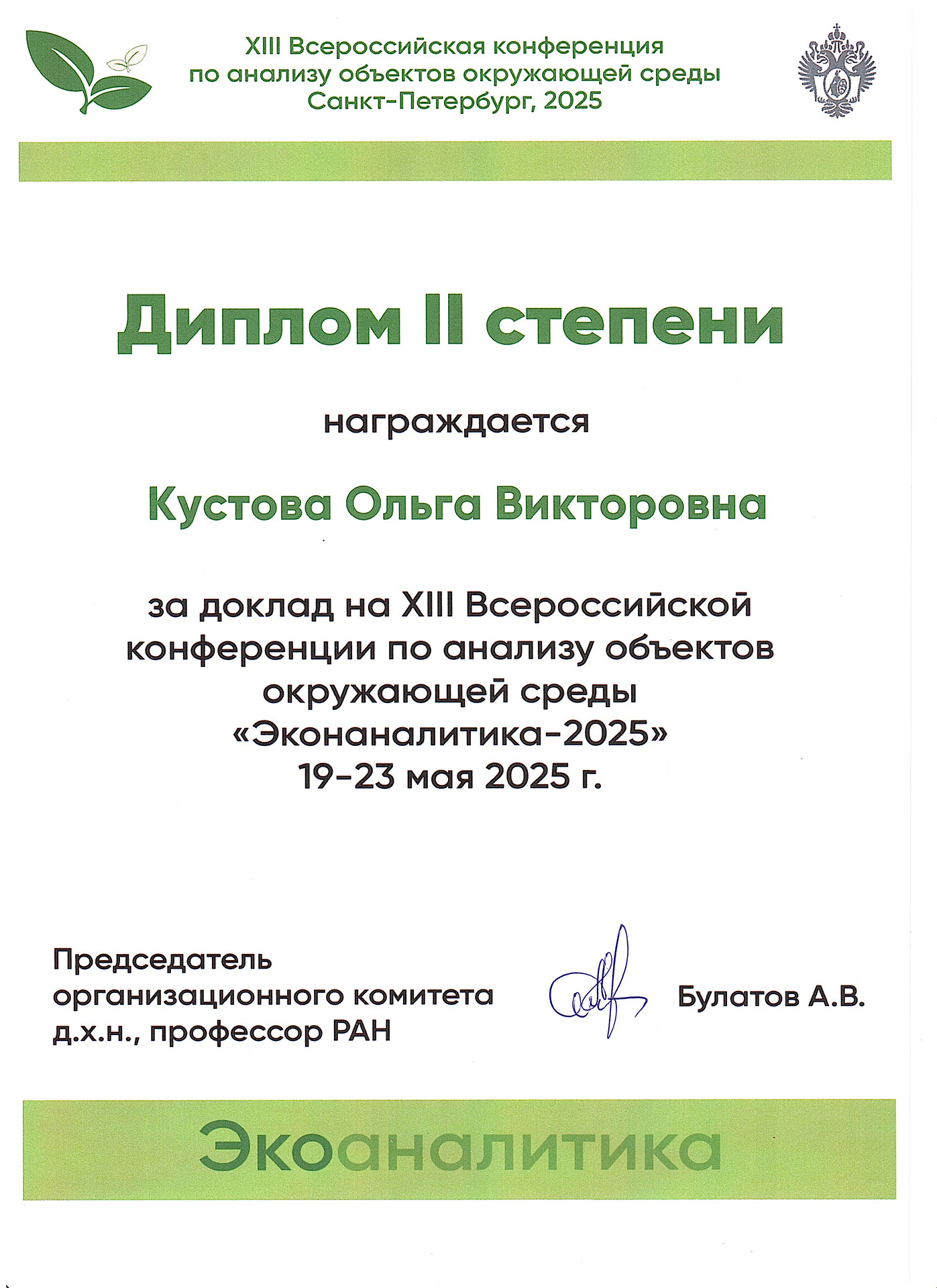 The employees of the Laboratory of Chromatography and Laboratory of Interdisciplinary Environmental and Economic Research and Technologies took an active part in the XIII All-Russian Conference “ECOANALYTICS - 2025” on the analysis of environmental objects, which was held on May 19-23, 2025 in St. Petersburg.