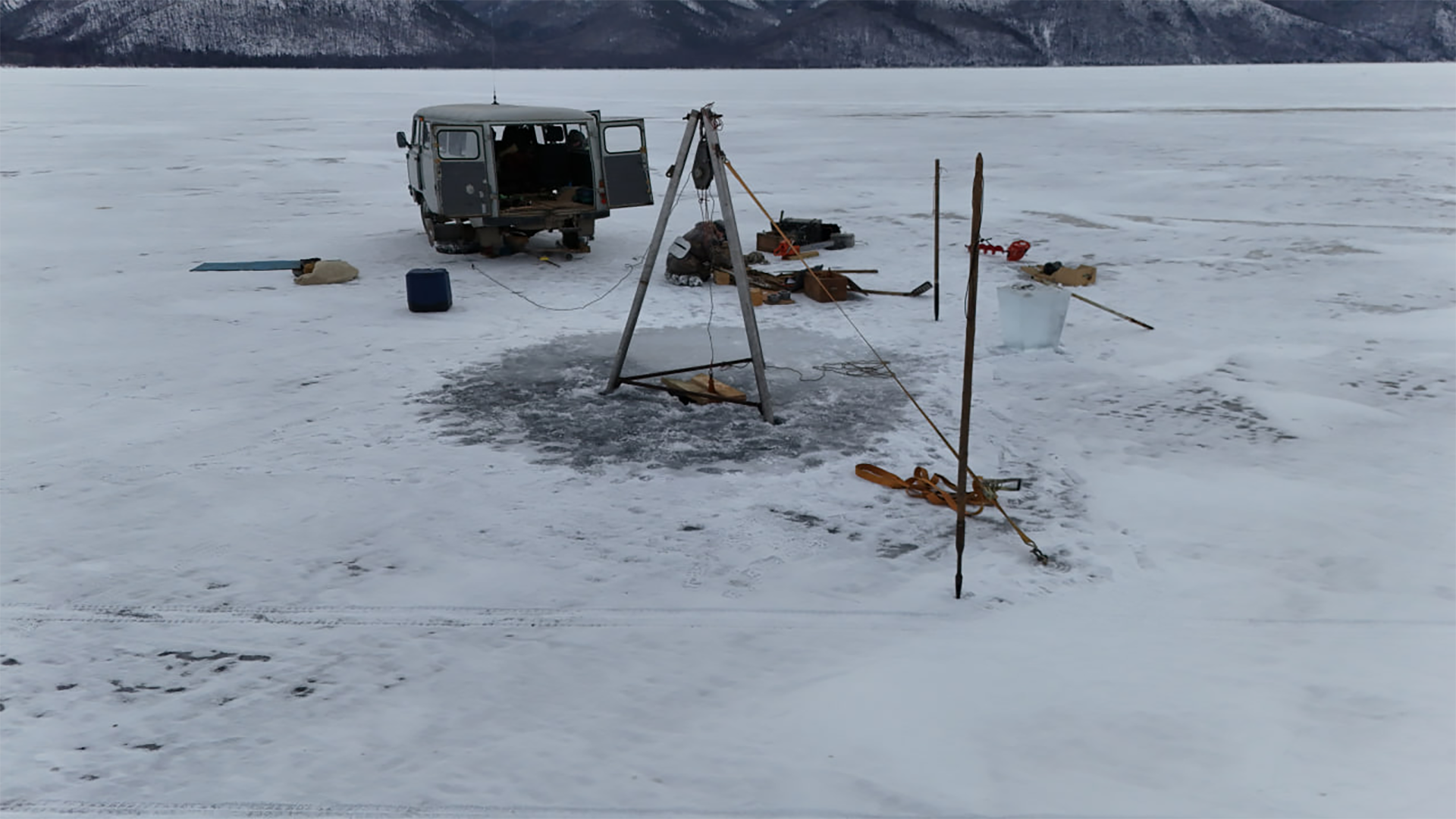 С 25 по 28 февраля 2025 г. со льда в средней котловине оз. Байкал, район п. Сухая проходили экспедиционные работы в рамках теме гос. задания «Изучение функционирования гидратных, нефтяных и газообразных углеводородных систем и сопряженных с ними микробных сообществ в озере Байкал» № 0279-2021-0006 (рук. Земская Т.И., Хлыстов О.М.) и «Исследование адвективного и турбулентного водообмена Байкала и его влияния на экосистему озера, риски катастрофических явлений» № 0279-2021-0004 (рук. Асламов И.А.).