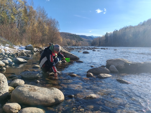 Для анализа экоДНК речных популяций байкальского осетра пробы воды (по 2 литра воды каждая) были отфильтрованы через стеклянные фильтры, которые затем были помещены в пробирки с 95% этанолом. В дальнейшем из фильтров будет выделена экоДНК. Полученные экстракты будут проанализированы с помощью количественной ПЦР и молекулярного метабаркодинга целевых фрагментов ДНК. Полученные данные позволят дополнить информацию о распространении байкальского осетра в пределах района исследований.