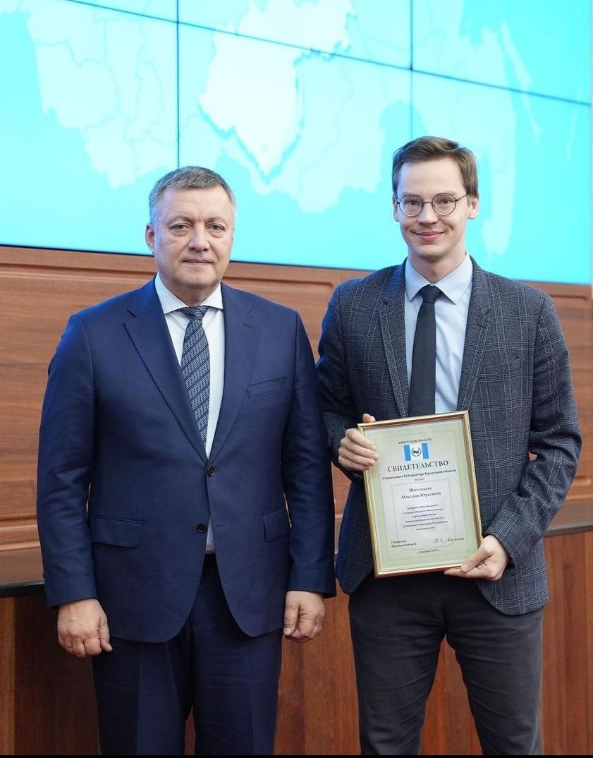 В декабре 2023 были подведены итоги конкурса на присуждение именных стипендий Губернатора Иркутской области, в числе победителей молодой сотрудник нашего института – Максим Шиховцев. Сегодня состоялась церемония награждения обладателей именных стипендий, где губернатор Игорь Иванович Кобзев лично поздравил стипендиатов и вручил им награды.